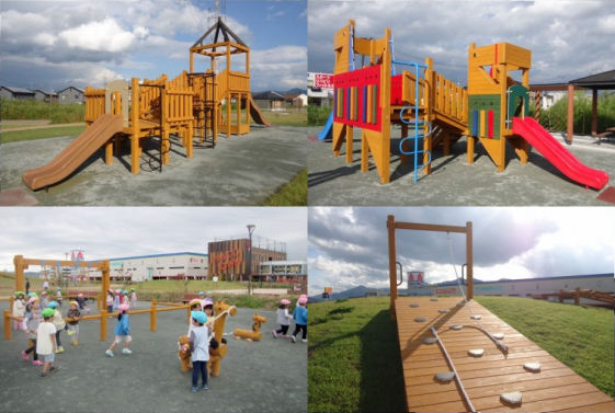 「盛岡南地区都市開発整備事業」によって誕生した新しい公園です。地元盛岡市産の杉材を使用し、「盛岡らしさ」を盛り込んだデザイン遊具(盛岡城、チャグチャグ馬こ、鮭の遡上、三大麺等)でぜひお楽しみください。